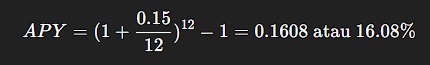 Artinya, meski APR hanya 15%, APY menghasilkan imbal hasil efektif 16,08% karena efek bunga berbunga.