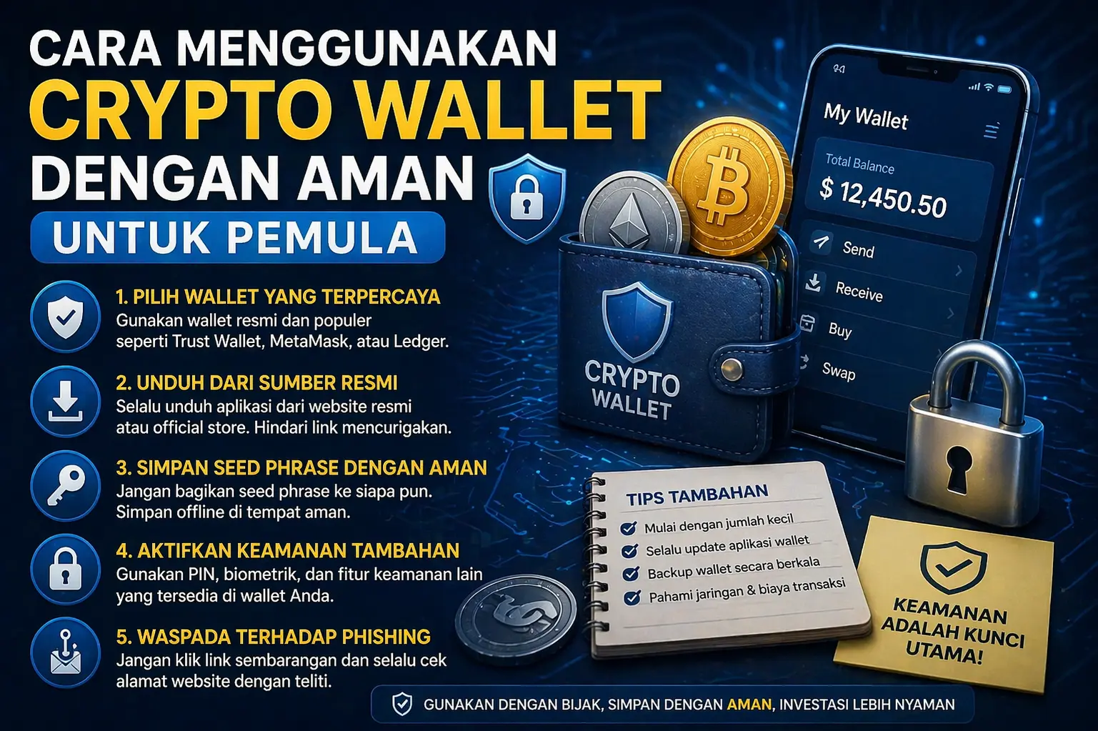 - Gunakan wallet yang tepat (hot vs cold)