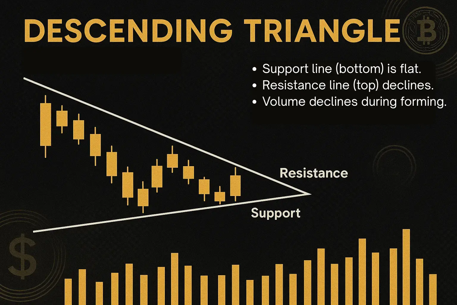 Unlike the ascending triangle, this pattern indicates increasing selling pressure. Sellers gradually lower the peak price, while buyers can only maintain the same support level. When that support is finally broken, prices usually fall further, marking a bearish breakout.